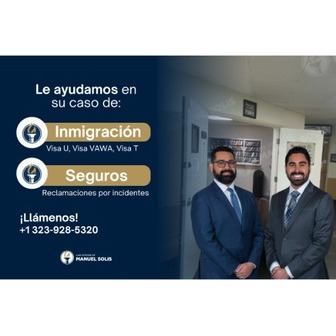 Abogado de Inmigración Manuel SolÍs, con más de 34 años de experiencia y 50,000 casos ganados, le guÍa en su trámite de visa humanitaria: visa U, visa VAWA, visa T, visa juvenil, permiso de trabajo en USA y residencia permanente en USA. Contamos con representación legal en todo Estados Unidos y también ofrecemos asesorÍa en áreas legales como derecho familiar, accidentes, negligencia médica, derecho civil y criminal. Nuestro equipo de más de 200 profesionales analiza cada situación de manera detallada, elaborando estrategias legales personalizadas que buscan proteger sus derechos. Ofrecemos servicios legales en español e inglés, brindando atención cercana, asesorÍa confiable y compromiso total con cada cliente migratorio o legal.